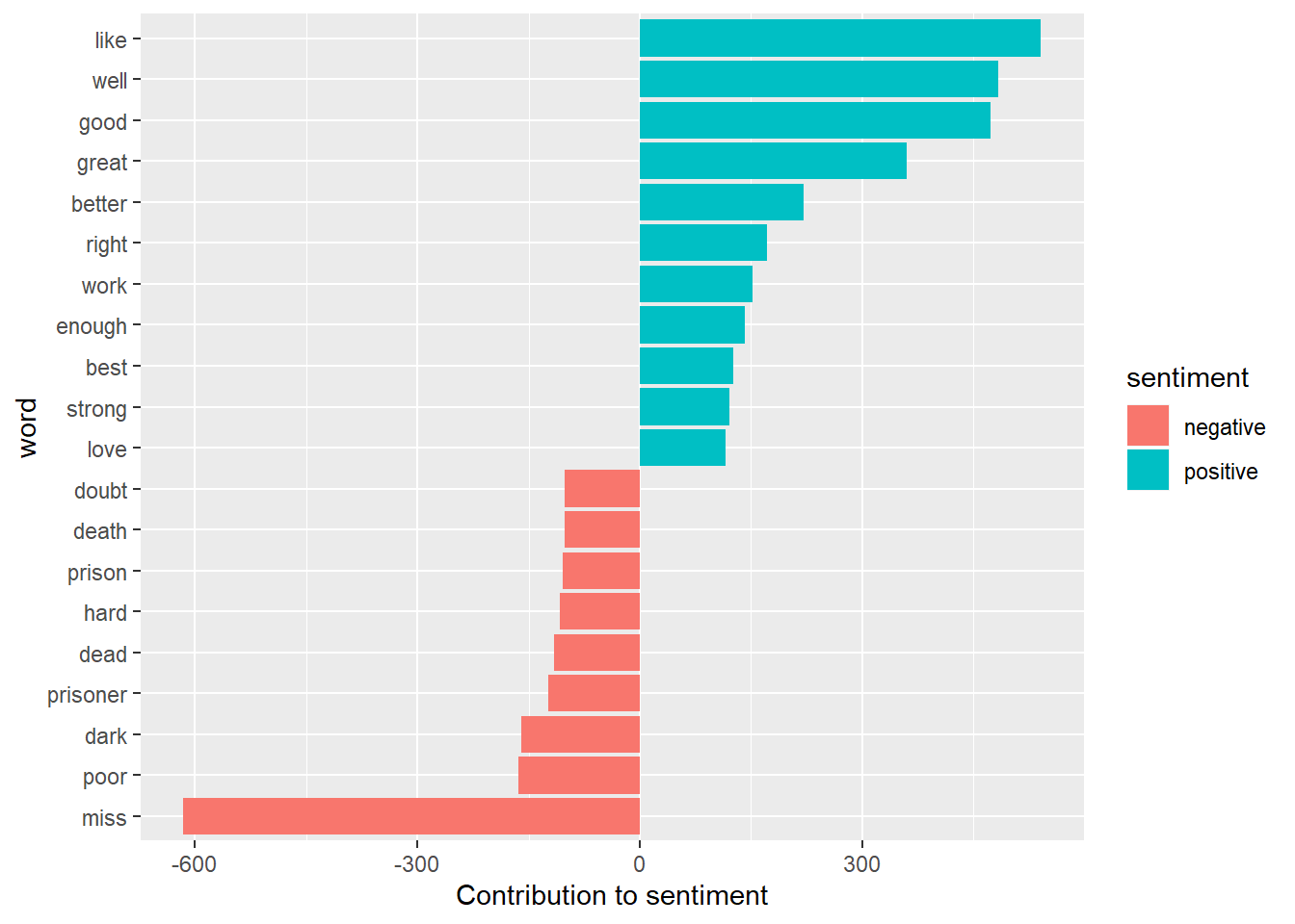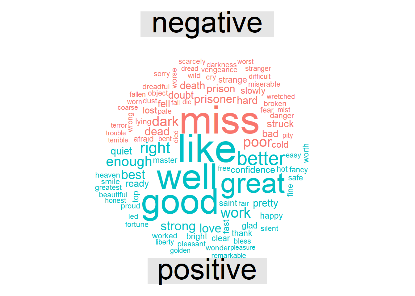 This lets us spot an anomaly in the sentiment analysis; the word “miss” is coded as negative but it is used as a title for young, unmarried women in Jane Austen’s works. If it were appropriate for our purposes, we could easily add “miss” to a custom stop-words list using bind_rows.
